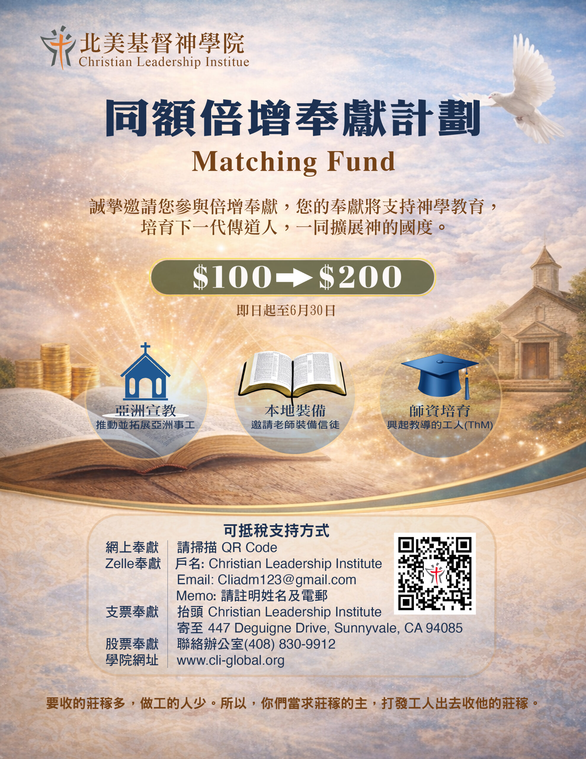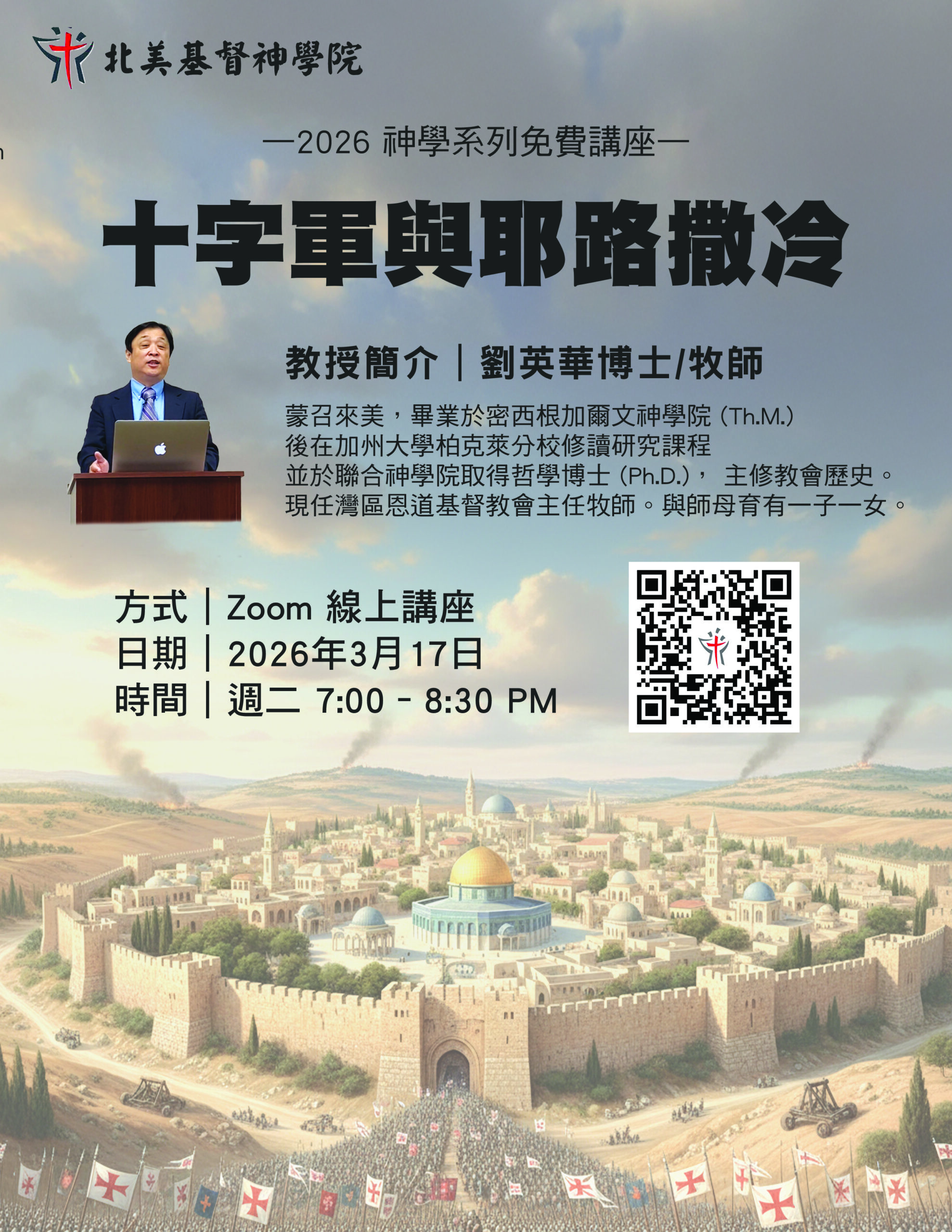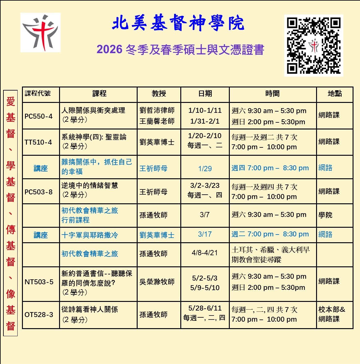 Full 1愛基督、學基督、傳基督、像基督Full 2學制課程 | CoursesBrowse classesFull 3申請入學 | AdmissionsApply to our program2026 初代教會-B20260317 十字軍與耶路撒冷 劉英華- B1202603 逆境中的情緒智慧-B202605 新約普通書信_lighter-B202606 詩篇-B 院訓:愛基督,學基督,傳基督,像基督 詳情請按此 網上報名 網上報名 網上報名 網上報名 要收的莊稼多,作工的人少。 所以,當懇切祈求莊稼的主打發工人出去,收他的莊稼。The harvest is plentiful, but the laborers are few. Therefore, pray earnestly to the Lord of the harvest to send out laborers into his harvest. 北美基督神學院簡介